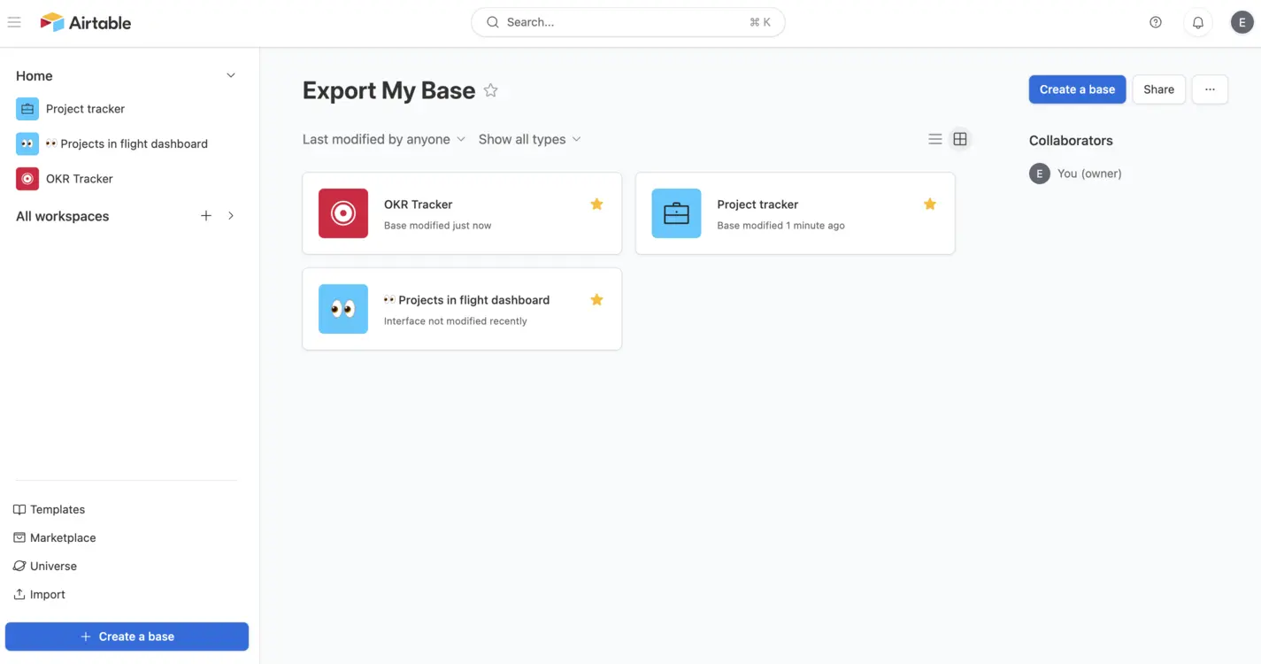 Before diving into the step-by-step export process, it's helpful to know that you have a few different options to export your Airtable data. You can choose to manually export single tables using the native capabilities of the Airtable tool or use third-party tools to export an entire base at once.