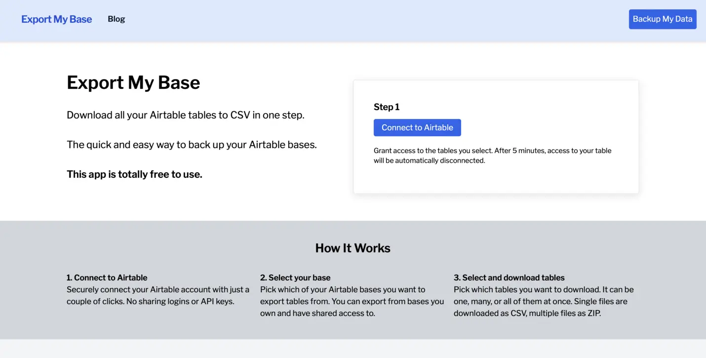 Click the "Connect to Airtable" button to begin connecting your Airtable account. Export My Base will only connect to the base(s) for which you grant permissions in the following steps.