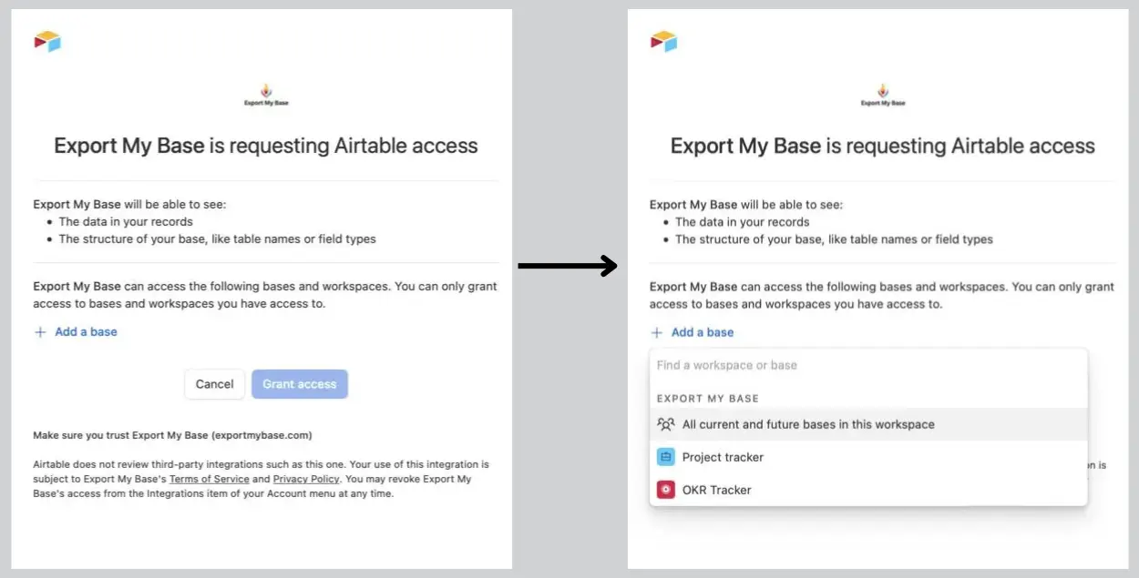 Step 3: Select all base(s) from which you would like to export data and grant access