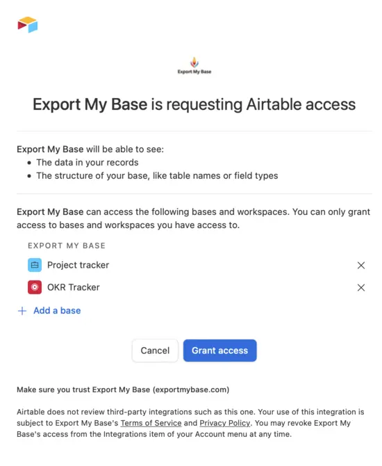 After you've selected your base(s), click "Grant Access" to allow Export My Base access to backup your data.