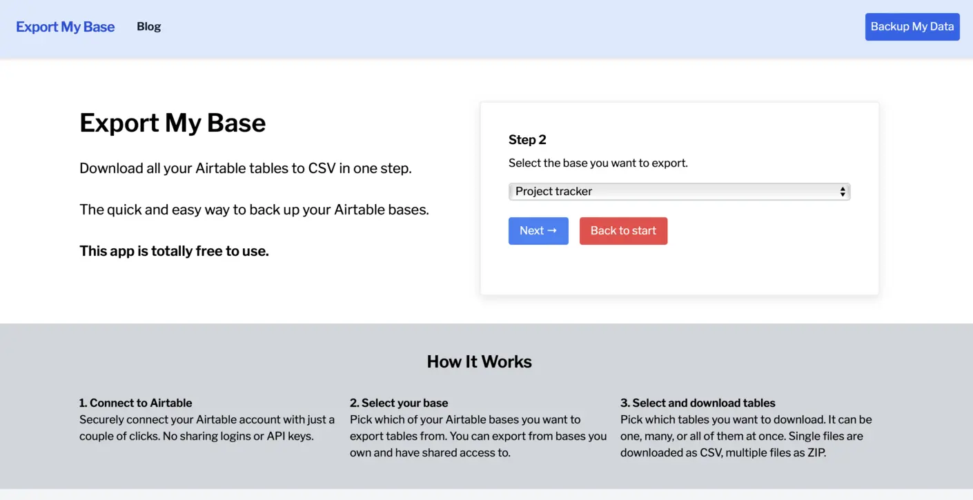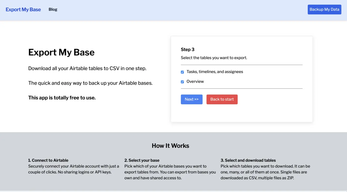 Select as many tables as you would like. If you select more than one table, Export My Base creates a convenient ZIP file that contains all of your CSV backup files. When you're ready to download, click "Next".