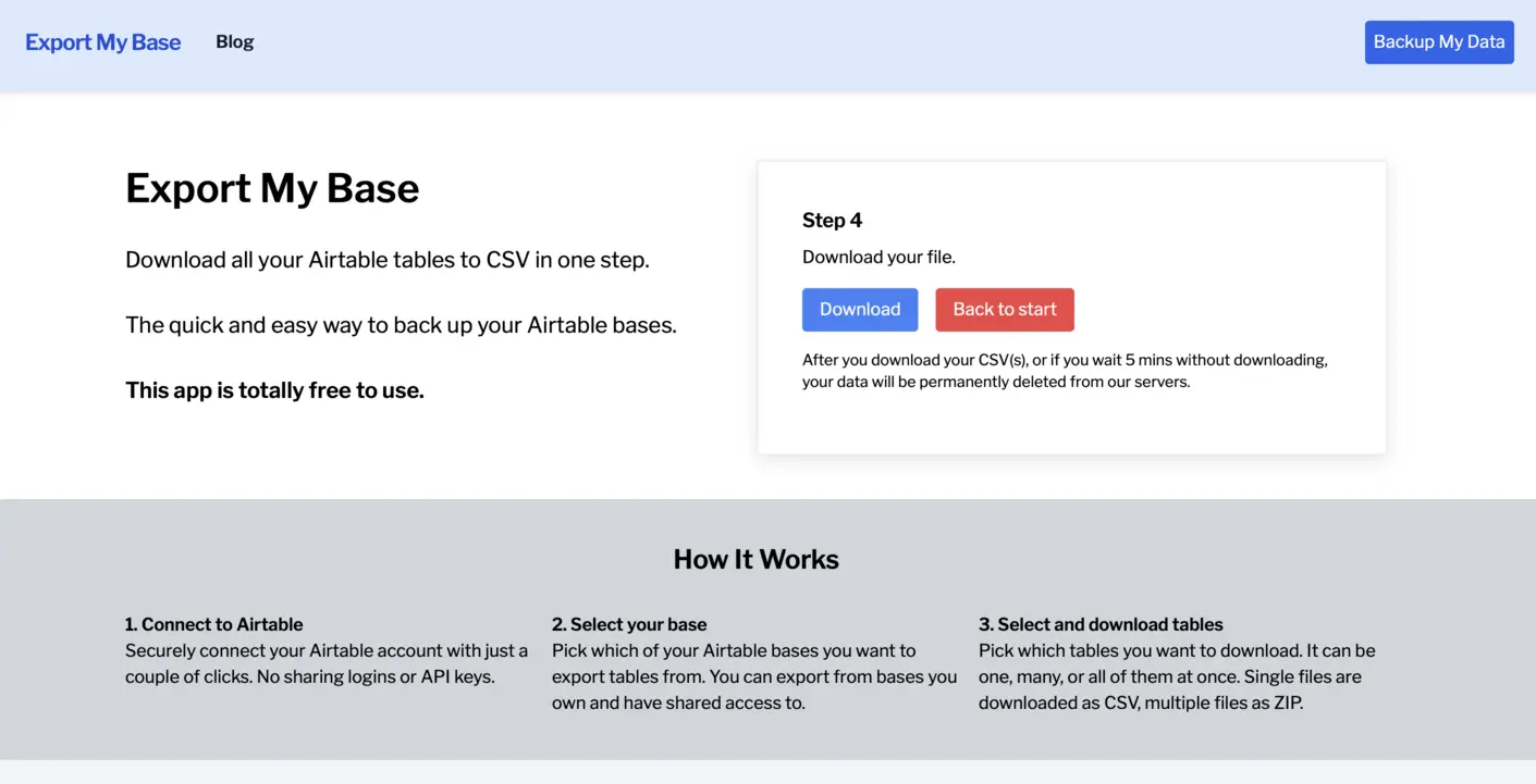 Export My Base will compile the information within the selected table(s) and prepare a file for you.